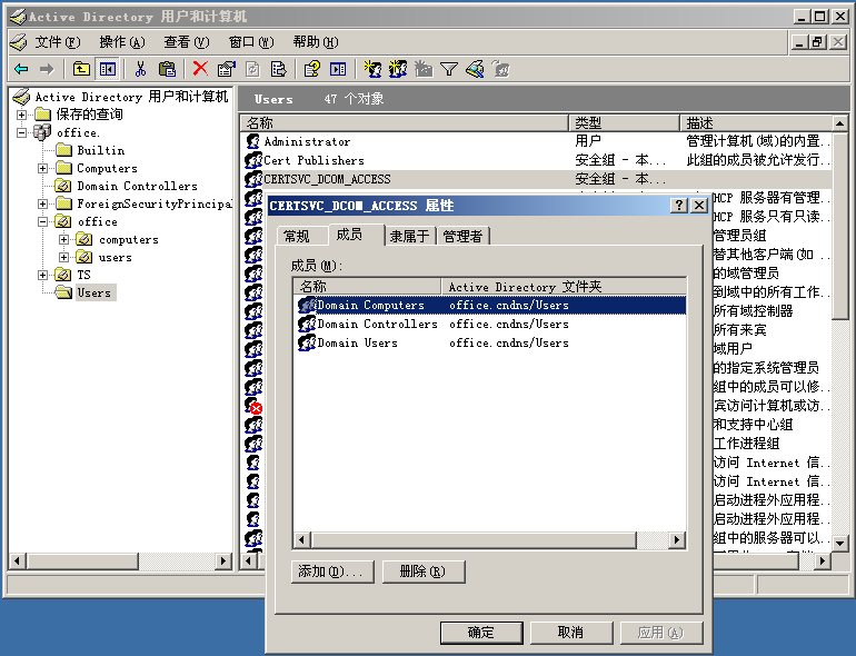 一台额外 DC 控制器,在 AD 中部署了证书服务之后,该额外 DC 控制器出现来源:AutoEnrollment,ID:13 的应用程序警告。参考:KB903220 ,地址:http://support.microsoft.com/kb/903220/zh-cn。发现域控制不隶属于 CERTSVC_DCOM_ACCESS 组。使用 ADUC 将 Domain Controllers 加入到 CERTSVC_DCOM_ACCESS 组,重新启动该额外 DC 控制器,问题解决。