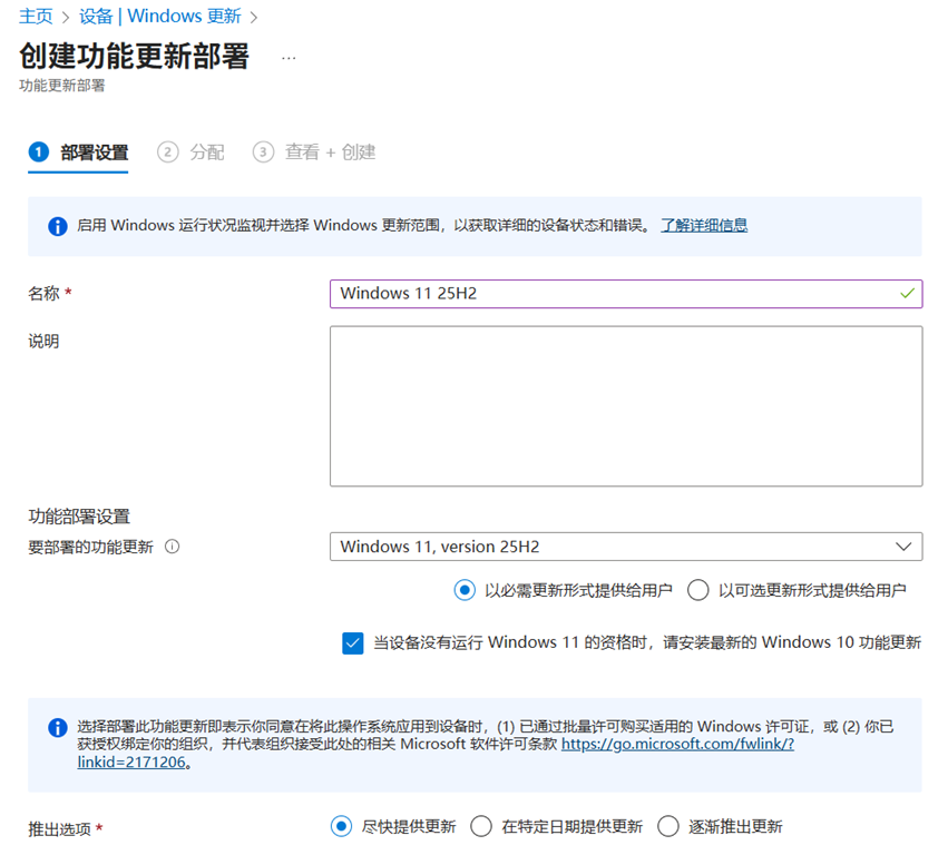 - 对于已经在使用 Microsoft Intune 现代管理的组织,已经可以创建 25H2 的功能更新部署策略。