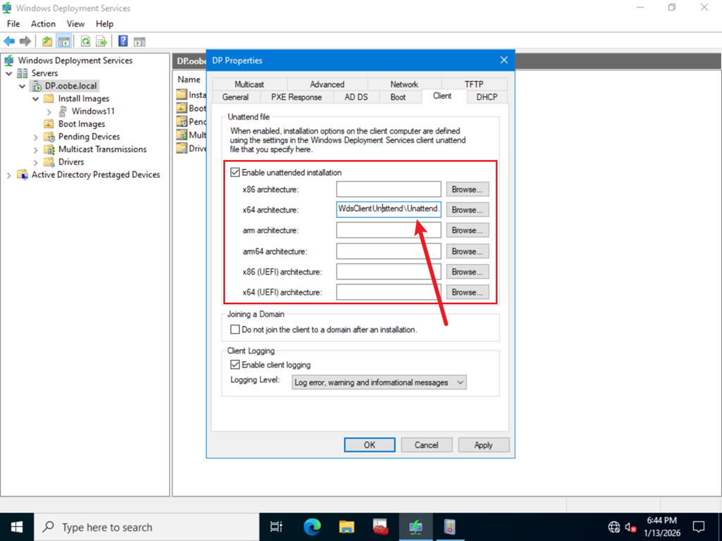 • 将会看到警告日志,并记录“Warning: Unattend file request was made over an insecure connection. Windows Deployment Services has blocked the request to keep the system secure. For more information, see: https://go.microsoft.com/fwlink/?linkid=2344403”